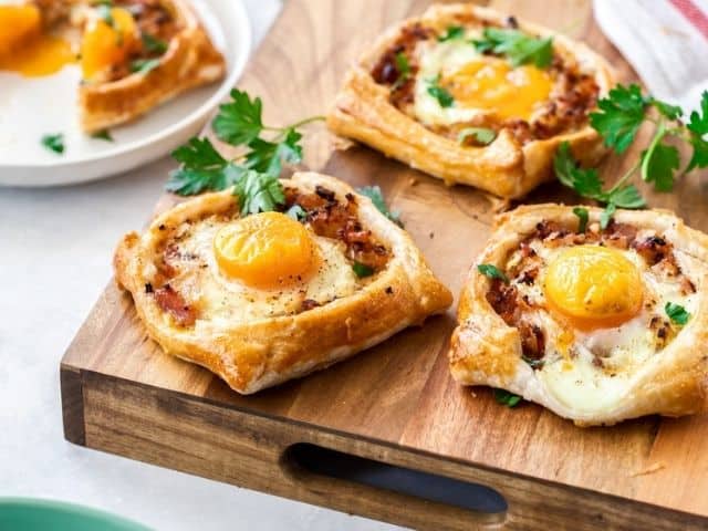 Brush the exposed crust with the egg wash, sprinkle with a pinch of salt, and bake for 25–30 minutes, until the crust is golden and the eggs are just set. If the crust starts browning too quickly, shield the edges with a foil ring and reduce heat to 375°F (190°C). A little wobble in the egg center is a good sign—this is how you know the yolk stays luxuriously runny inside.