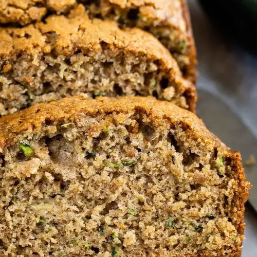 Using a sharp knife, slice your beautiful, moist zucchini bread. I find it slices best when it’s completely cooled, especially with the glaze. Enjoy a slice with your morning coffee or as an afternoon treat. It’s perfect just as it is!
