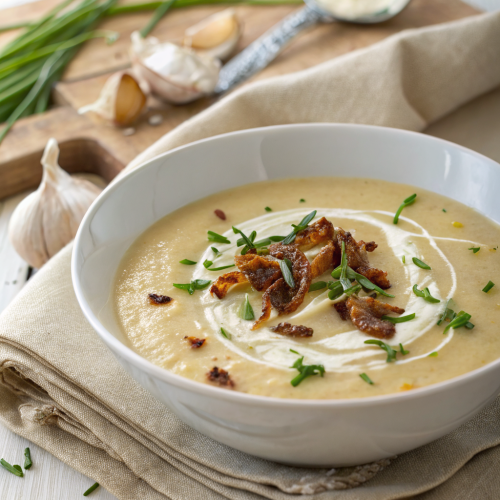 You’ll need: 4 large Yukon Gold or russet potatoes (peeled and diced), 1 medium onion (finely chopped), 3 cloves garlic (minced), 3 tbsp butter, ⅓ cup all-purpose flour, 4 cups chicken or vegetable broth, 1 cup half-and-half or light cream, 1 tsp salt (plus more to taste), ½ tsp black pepper, ½ tsp dried thyme (optional), and fresh parsley or chives for garnish.