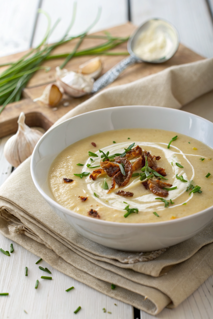 You’ll need: 4 large Yukon Gold or russet potatoes (peeled and diced), 1 medium onion (finely chopped), 3 cloves garlic (minced), 3 tbsp butter, ⅓ cup all-purpose flour, 4 cups chicken or vegetable broth, 1 cup half-and-half or light cream, 1 tsp salt (plus more to taste), ½ tsp black pepper, ½ tsp dried thyme (optional), and fresh parsley or chives for garnish.