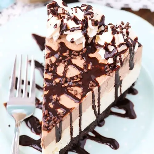 - Pipe whipped cream around the edges of the cake. Drizzle chocolate sauce on top if desired and freeze until ready to serve.
