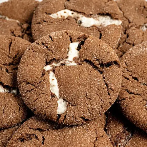 - Use a 1.5- 2 tablespoon cookie scoop to scoop out 24 even sized scoops of dough. Roll into a ball then flatten into a disc. Place several inches apart on prepared cookie sheet. Top with about 5-6 mini marshmallows, then wrap the dough around the marshmallows, pinching the seams closed. Roll dough until smooth, then roll in remaining 0.25 cup of granulated sugar to coat them.