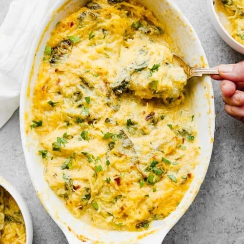 - Adjust salt and pepper to taste, add cooked spaghetti squash and baby spinach, pour into a baking dish and sprinkle parmesan cheese on top.