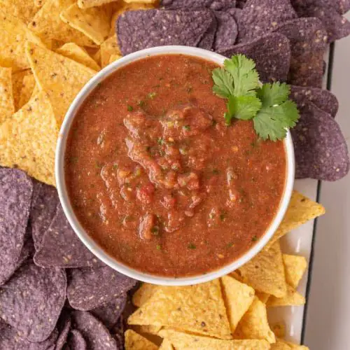 - Taste test the salsa using a tortilla chip and adjust seasoning with additional salt, sugar, or lime if needed. For best flavor, let the salsa rest in the refrigerator for at least 1 hour before serving.