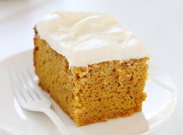 Freezer Instructions: Wrap individual slices tightly in plastic wrap and then foil or place in a freezer bag. Frozen pumpkin cake stays fresh for up to 3 months. Thaw overnight in the fridge or for a couple of hours on the counter before reheating.
