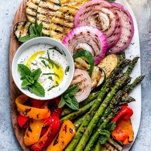 This grilled vegetables yogurt mint sauce is so adaptable, it fits into almost any meal plan. Here are some of my favorite ways to serve it: