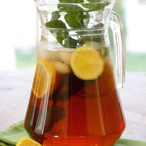 - Discard tea bags (do not squeeze or tea will be bitter) and combine the brewed tea with the remaining 4 cups of cold water and fresh mint leaves.