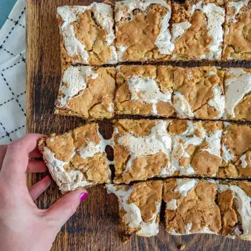 Once completely chilled and set, use a sharp knife to cut the bars into squares. For the cleanest cuts, I often wipe the knife with a warm, damp cloth between slices. Serve these wonderful Peanut Butter S’mores Bars at room temperature. They’re incredible on their own, but also fantastic with a cold glass of milk or a hot cup of coffee!
