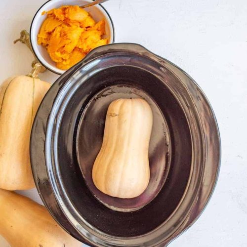 - Place the whole unpeeled butternut squash in the slow cooker. No water is needed.