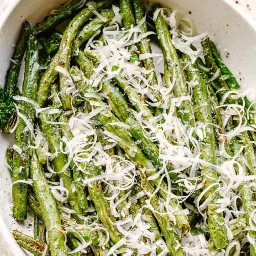 - Remove the green beans from the oven, top with grated parmesan cheese, and serve.