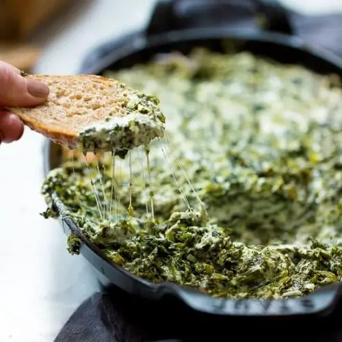 Once it’s out of the oven, let the spinach dip sit for about 5-10 minutes before serving. This allows it to cool slightly so it’s not scalding hot, and it also helps the dip set up a little more, making it perfect for dipping.