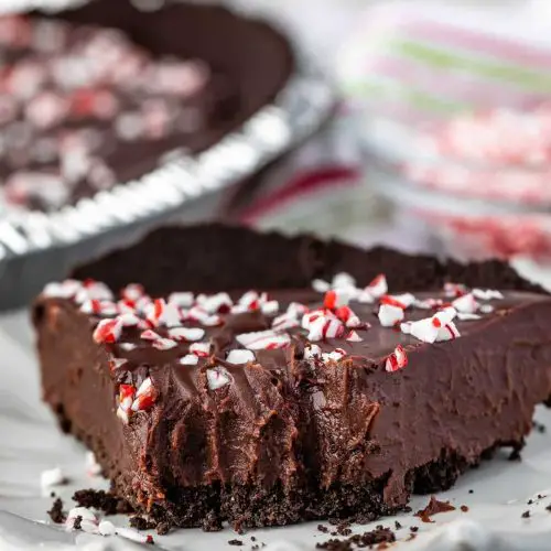 - Pour the peppermint ganache into the Oreo pie crust. Sprinkle crushed candy canes evenly over the top.