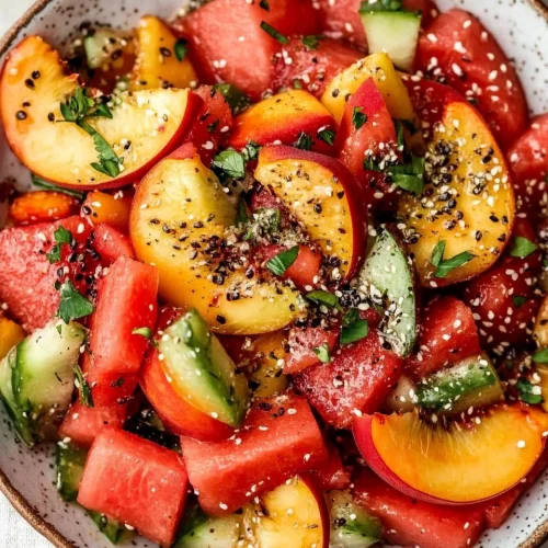 What are some good reasons to make this Peach Watermelon Salad?flavor is just out of this world. It’s that perfect sweet and tangy combination that’s so addictive. The natural sweetness of the peaches and watermelon is so pure, and the little zing from the lime and mint just makes it pop. It’s like a little party in your mouth! And then there’s the simplicity. I mean, *seriously*. This is a lifesaver on busy days. You just chop, toss, and serve. No cooking involved, which is my favorite kind of magic when the weather’s warm. It’s so easy to whip up, even when you’re short on time or energy. Plus, it’s incredibly cost-efficient. Peaches and watermelon are usually abundant and reasonably priced during the summer months, making this a budget-friendly way to impress your guests or just treat yourself without breaking the bank. What really sets this apart for me, though, is its versatility. I’ll talk more about serving suggestions later, but you can easily adapt it. Add some grilled chicken or halloumi for a light lunch, or toss in some feta for a savory twist. It’s a dish that truly shines in every situation. It’s just… so good, and so *easy*. What I love most about this is that it feels so decadent and special, but it’s ridiculously healthy and simple. It’s the best of all worlds!
