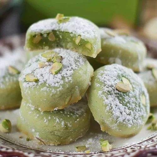 These pistachio wedding cookies are so wonderfully versatile; they’re not just for weddings, of course! They make a stunning addition to any occasion. For BREAKFAST, I love pairing them with a strong, hot cup of coffee or a creamy latte. Their subtle sweetness is the perfect counterpoint to a rich morning brew. I often arrange a few on a small plate next to my mug. For BRUNCH, they elevate any spread. Imagine them nestled on a tiered stand alongside pastries, fruit, and quiches. They look particularly elegant when served with a sparkling rosé or a light mimosa. As DESSERT, they are simply divine. They’re fantastic after a rich meal, offering a light, flavorful finish. Serve them with a dollop of mascarpone or a scoop of vanilla bean Ice Cream for an extra treat. I also find them to be the perfect accompaniment to a good cup of herbal tea, like chamomile or mint. And for COZY SNACKS, well, this is where they really shine for me at home. They’re the ideal companion for an afternoon cup of tea or a late-night sweet craving. My kids (and my husband!) absolutely love them with a tall glass of cold milk. Honestly, any time you want a little moment of delicious indulgence, these cookies are the answer. My family tradition is to have a plate of these ready for any unexpected visitors because they always disappear so quickly!