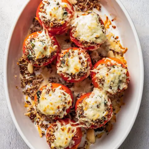 Freezer Instructions: I don’t recommend freezing the assembled dish as tomatoes and greens can become mushy. If you want to freeze, you can freeze the quinoa filling separately once it’s cooked and cooled, then reassemble into fresh tomatoes and bake from frozen. You’ll want to add 5–10 minutes to the bake time and expect a slightly softer texture.