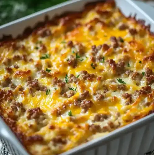 This Sausage Hash Brown Casserole is so versatile, it honestly works for almost any meal occasion. For a classic weekend breakfast, I love pairing it with a simple side of fresh fruit – berries are always a hit! A perfectly brewed cup of coffee or some fresh orange juice is the perfect accompaniment. When we’re doing brunch, I like to make it feel a little more special. I’ll often serve it alongside a fresh green salad with a light vinaigrette, or maybe some crispy bacon or scrambled eggs for those who want an extra protein boost. Mini muffins or a fruit salad add a touch of elegance too. If you find yourself with leftovers (which is rare in my house!), they make for a surprisingly satisfying dessert. Seriously, a small warm slice can hit the spot when you’re craving something savory and cheesy late at night – it’s like a grown-up grilled cheese, but better! For cozy snacks or a casual get-together, it’s perfect on its own. You can even cut it into smaller squares and serve them as appetizers. My family also loves having this on chilly evenings with a cup of hot chocolate; it feels incredibly comforting and hearty. My personal favorite is when we have it for Sunday brunch and serve it with a side of homemade salsa and a dollop of sour cream – it’s simple perfection!