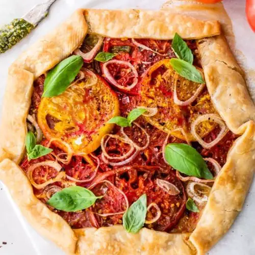 - Place pie dough on a parchment-lined baking sheet. Leaving a 2-inch rim of dough, spread pesto evenly in the center; layer with tomatoes and shallots on top of the pesto. Fold the rim of dough into rustic pleats, covering some of the filling. Refrigerate, minimum 15 minutes to set.