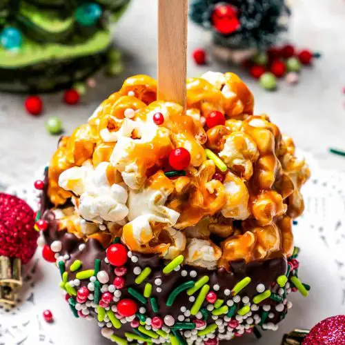 - Insert a popsicle stick into each popcorn ball, dip into melted chocolate, then roll in sprinkles. Place on wax paper and let chocolate set before serving.